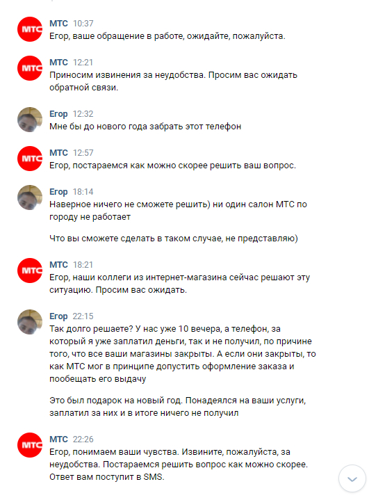 Далее мне вся эта история уже порядком надоела и тогда, я решил забить на все и пойти домой, понимая, что никакого телефона в Новом году у меня уже не будет. Параллельно со всем этим, общался с поддержкой МТС ВКонтакте, но толку от этого тоже никакого не было.