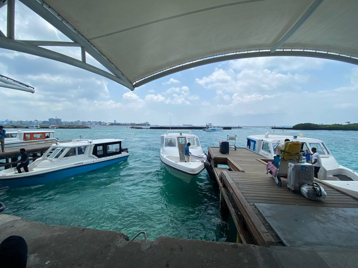 Прилетев на остров, мы на удивление быстро прошли паспортный контроль (привет родная Куба),на выходе встретил гид и сопроводил на стойку с названием отеля, угостили бутылочкой с водой, и мы стали ждать скоростного катера который доставит до острова. Приключение через открытый Индийский океан через волны составил чуть больше часа, поэтому в идеале взять с собой беруши, чтобы не заложило от звука мотора)