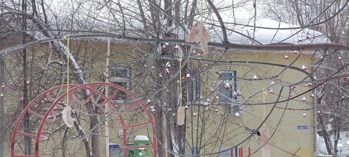 Купил я тут надысь свининки, четвертинку. Разделал, осталось много шкуры с тонким кусочком никуда не пригодного сала толщиной в сантиметр. Ну думаю синичек покормлю, потому что в мусорку вообще не вариант, так только бродячих псов накормлю. Отрезал пару дециметровых кусков, повесил на дерево. На следующий день заглянул - счистили сало до дыр. Думаю мало наверное... повесил ещё несколько. На следующий день то же самое. Думаю уже - да обожритесь вы, развесил по близлежащим деревьям оставшееся и в кормушку ещё нутряного жира запихал... Суммарно килограмма 3 вместе со шкурой. Вот третий день - ещё не съели. Но активно жрут. Зато дерево выглядит кринжово (слово сын подсказал) с висящими на нём кусками шкуры.