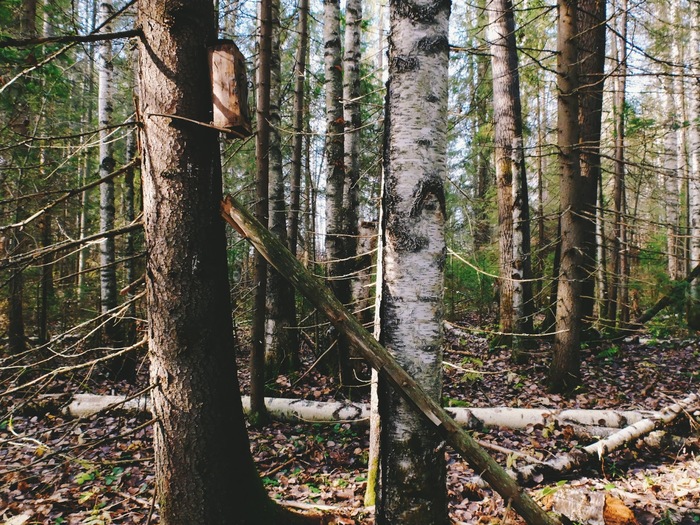 Чувствовалось что люди здесь бывают редко и только те кто "в теме", т.е. охотники и рыбаки. А значит можно не опасаться о загаженности мест и выбитой реке и тайге. Таким людям это просто не нужно, они кровно заинтересованны в том чтобы зверь в тайге водился, а в реке жила рыбка. По пути на нескольких деревьях я нашел ловушки на куницу. Такими ловушками на Урале мало уже кто пользуется, потому что почти не осталось охотников специализирующих на пушном звере. У самой кромки леса стоял балаган, с него караулят зверя.