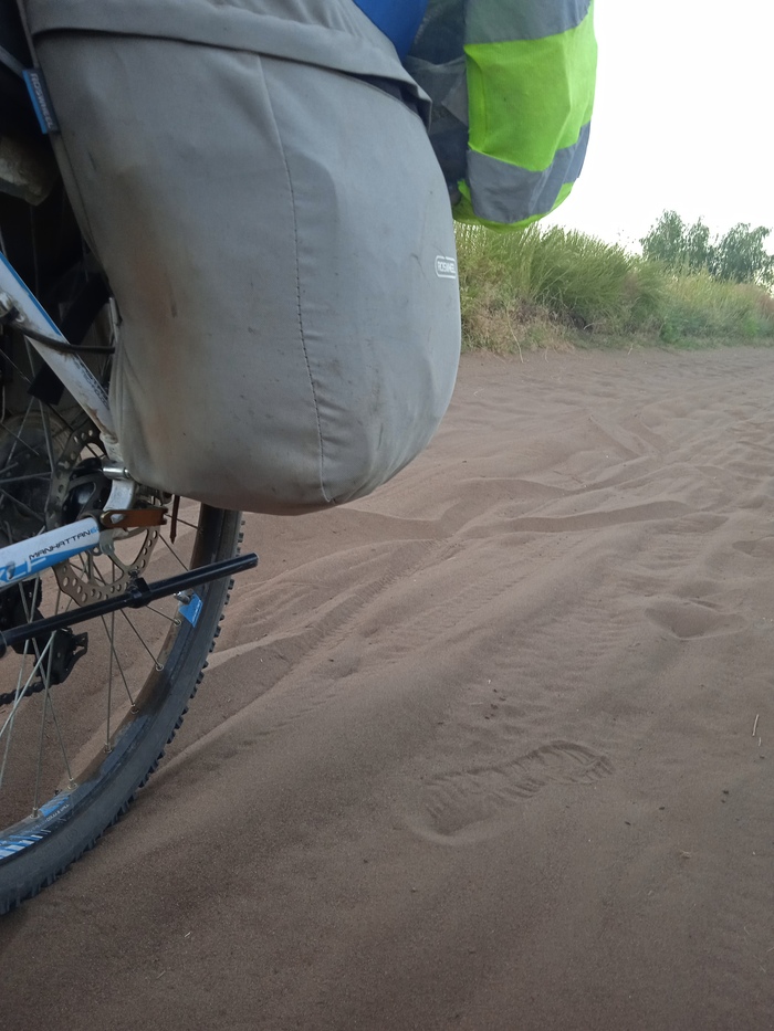 Ребята, кажется я побывал в пустыне. Ни когда не ездил по пескам, прямо по реальным пескам. В общем на последних десятках км. я ворвался на Тоцкий полигон.А там, а там пустыня, песка по уши. Колеса зарывались по обод, ехать было просто не возможно, в итоге с десяток верст протащил его волоком. Но это уже в конце дня. А так день начался великолепно, на берегу реки оборудованном под пикник. Позавтракал и отправился в путь. Дорога, как уже вошло в привычку, проходила по пересечённой местности. По пути мне попалось шикарное озеро, где я естественно искупался, смыл с себя всю дорожную пыль и устроил постирушки. Свеженький продолжил свое велопике. В один момент я выехал на гравийку, да из такого мелкого гравия, что колеса и там начали зарываться. Все бы ни чего, да вот только выяснилось, что я пропустил поворот и проехал этот участок в пустую, развернулся и опять побуксовал к деревне, вблизи которой я проворонил съезд.Уже ближе к 23-00, я добрался до промежуточной точки с. Тоцкое.