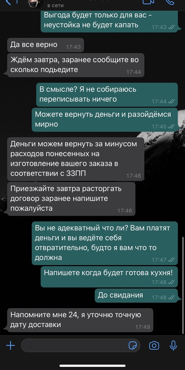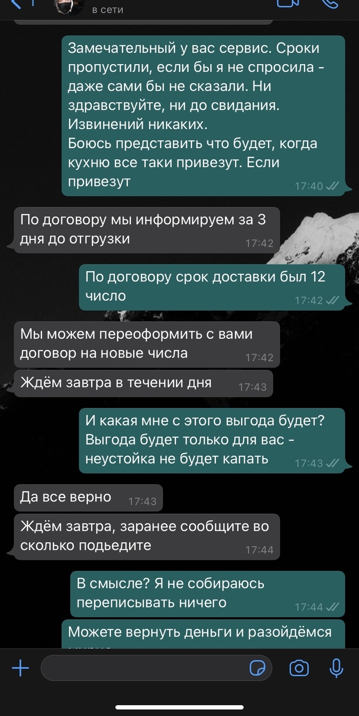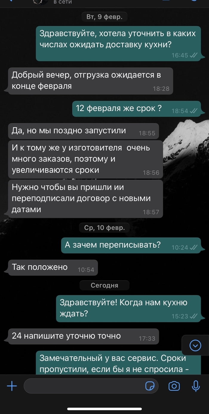 В январе с мужем решили заказать кухню, долго копили и наконец то свершилось. выбрали офис в мебельном универсальном магазине, хорошая кухня, сроки адекватные. Обещали доставить 12 февраля - и мы как наивные чукотские юноши разобрали старую кухню, все вынесли. Решила заранее написать тому, у кого заказывали кухню - когда ждать доставку, чтобы точно быть дома. И дальше начались танцы с бубнами.