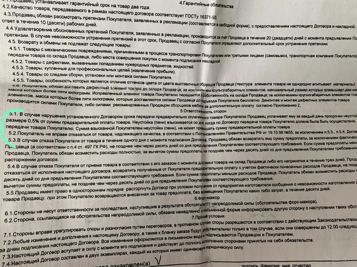 По договору за каждый день просрочки начисляется неустойка. Но чувствую, что в момент доставки, если она все таки будете, будет вторая часть представления с танцами и бубнами и я там на месте рожу раньше срока.