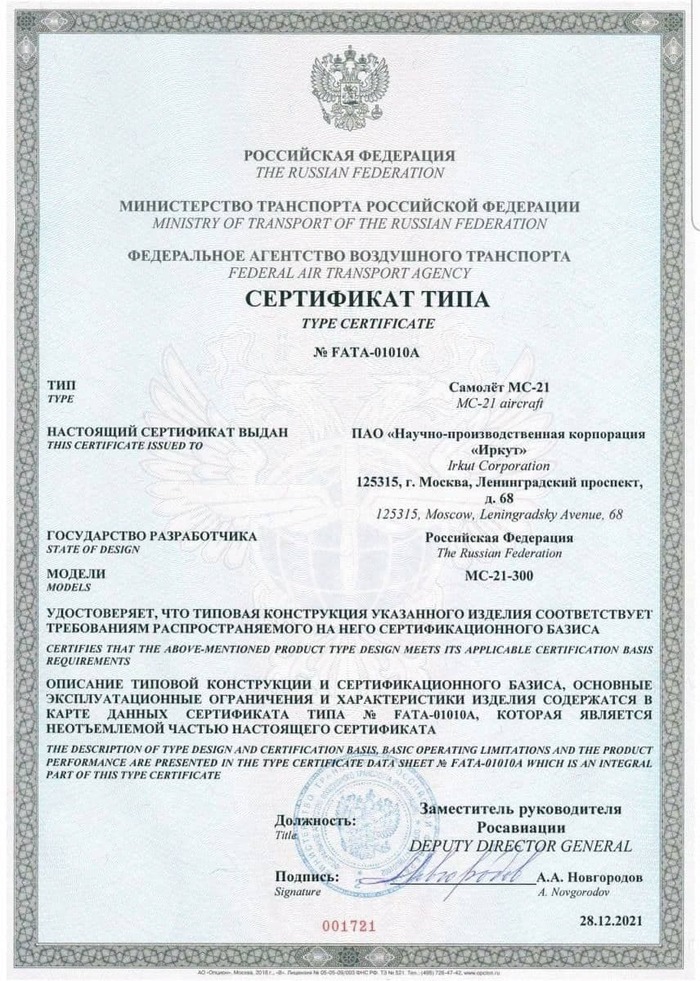 Российский самолет МС-21 с иностранным двигателем получил базовый сертификат типа