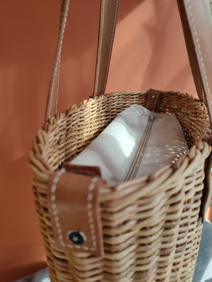 Все как всегда полностью сделала сама. Сплела основу из бумажной лозы, изготовила кожаные детали и сшила чехол.