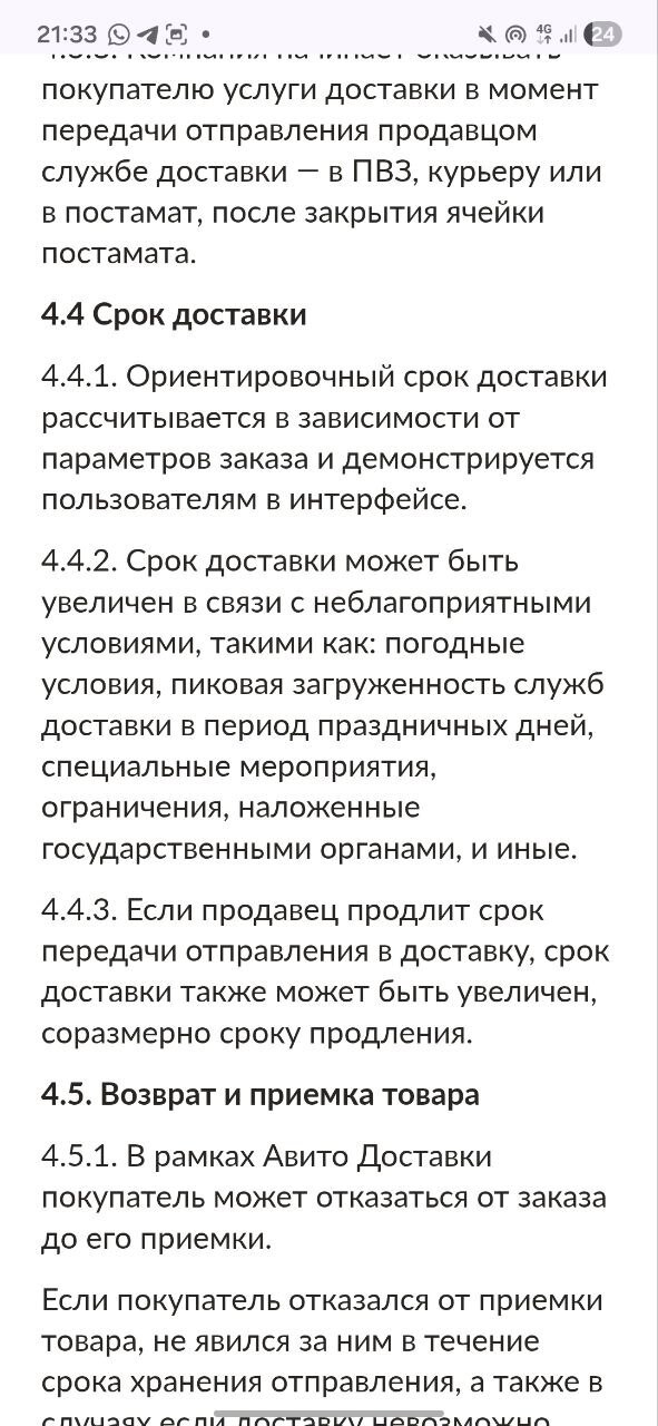 Почему вы ссылаетесь на п. 4.4.2. Срок доставки может быть увеличен в связи с неблагоприятными условиями, такими как: погодные условия, пиковая загруженность служб доставки в период праздничных дней, специальные мероприятия, ограничения, наложенные государственными органами, и иные.