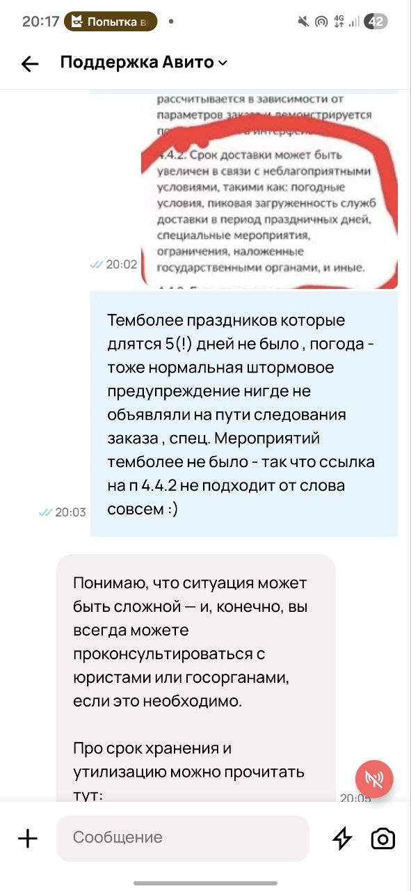 Честно авито вы как монополист задрали! Творите что хотите в чате ссылаетесь на п.п. которые обсолютно не подходят к указанному событию (вообе чтоли обурели слодности с логистикой - вы п.п. то свой прочитайте в предверии праздников, какие нахрен праздники). Ну чтож если сложиться так что мое имущество будет вами утилизированно - не обессудьте буду вынужден обратиться в суд :( Просто уже пригорело за 3 месяца 2 косяка и только с Авито доставкой - хвала почте РФ!
