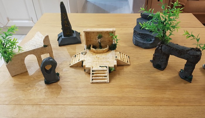 Играть с тапками вместо гор и сгущёнкой вместо башен это не комильфо, поэтому было решено закупить игровой "антураж" или говоря языком заморским - Террейн. Желание покупать быстро исчезло, потому как даже для поля в kill team хоть и меньше нужно всяких развалин, но даже это колличество стоило не прилично дорого (тогда ещё не было осознания что можно в пополам купить стартер с армиями и готовым ландшафтом). Посмотрев на всё это я вспомнил что когда-то в школьные далёкие годы я не плохо так мастерил на уроках труда и подумал: вроде руки золотые не из жо.., могу и сам склепать. Оставалось выбрать материал а также инструменты и время и заработу. Вариант картона быстро ушёл в сторону т.к. его так нехило гнёт от пва ибо нефиг столько лить и аэрографа (да на это тоже пришлось потратиться, но оно того стоило). В итоге я спёр мне на халяву достался пластик из которого жкх делают устойчивые к погодным условиям информационные таблички. Счастья не было предела: легкий, плотный, легко обрабатывать и резать.