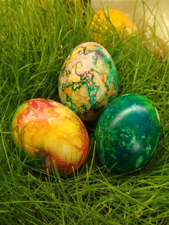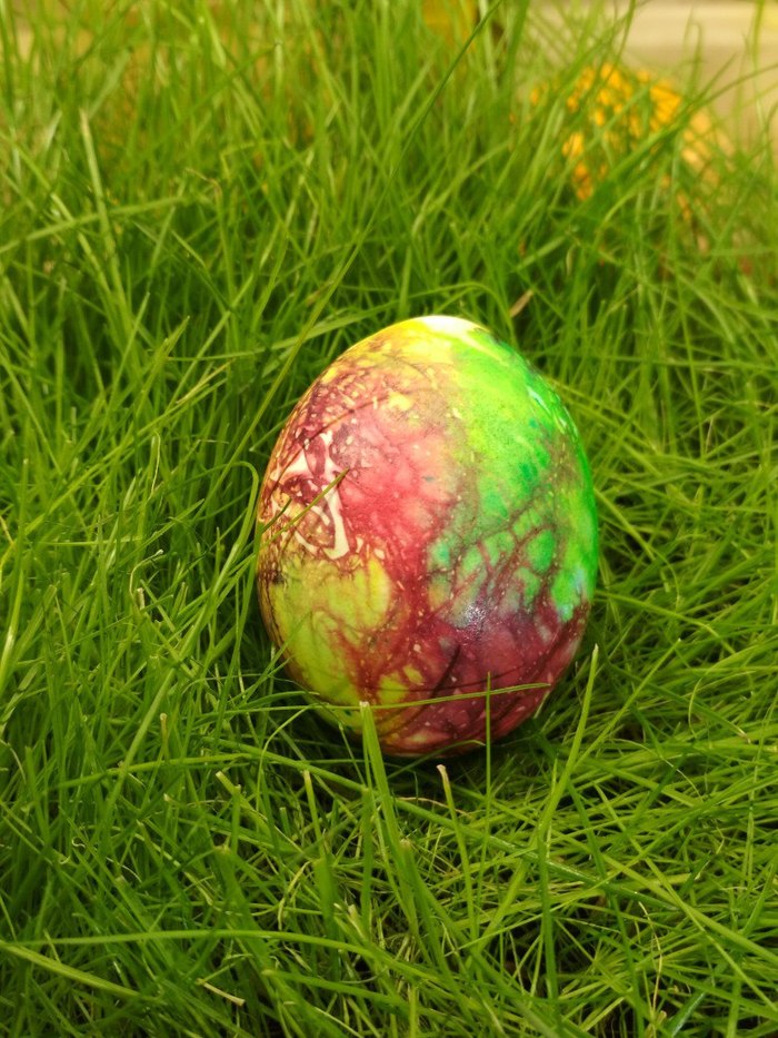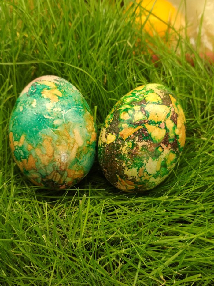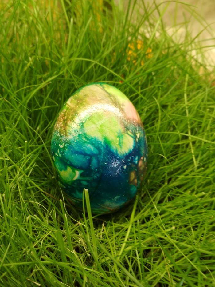 Надоели мне малахитовые и мраморые, тем более что раз от раза зеленка все сильнее смывается, а шелуха все хуже красит коричневым. И вспомнилось мне когда-то виденное космо-яйцо.
