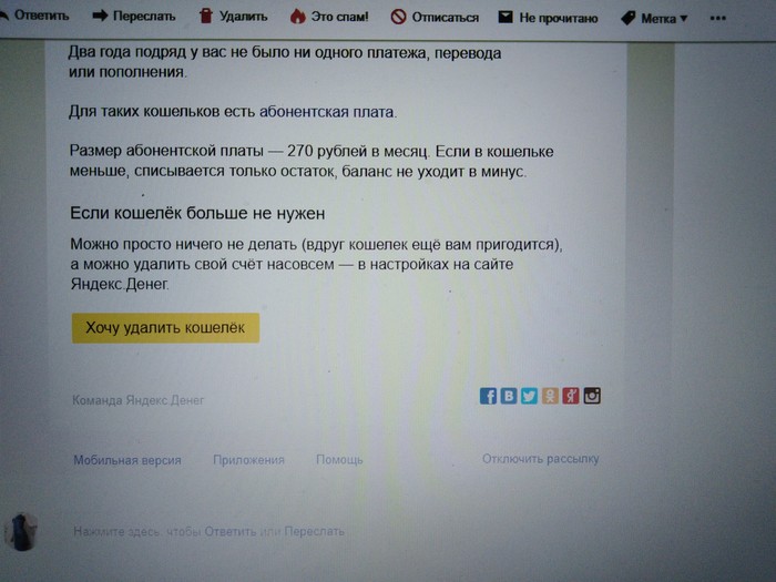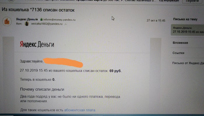Когда-то давно я открыла Яндекс-кошелек. Уже не помню по какой причине, но надо было срочно перевести деньги, а банковская карта перевыпускалась. После перевода на счету остались деньги. Ну я благополучно об этом и забыла, больше он мне пока не понадобился. На днях открываю почту и вижу замечательное письмо с информацией о том, что Яндекс просто прикарманил мои денежки, прикрываясь тем, что я давно не пользовалась кошельком, значит и деньги мне не нужны. Вот так. Ниже пруфы. Извиняюсь за качество фото, так как снимала с экрана компьютера.
