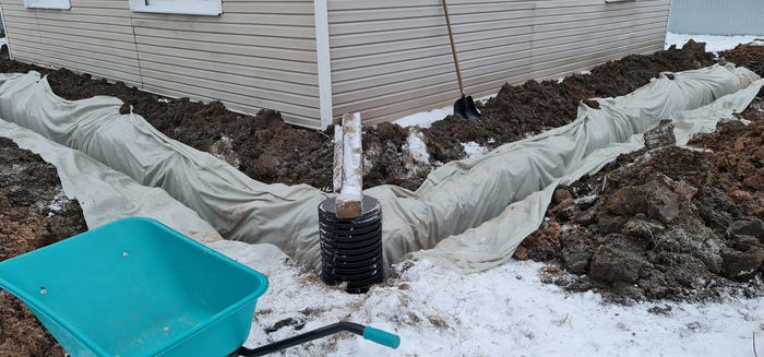 Приехал тот-же друг на минике. А дело было в октябре, под его конец. На улице морозец, землю уже прихватило. А так даже удобнее - ездишь и ходишь как по асфальту. Выкопали до темноты 3 траншеи с верхней точкой в -800мм, а нижней в -1300мм (12 метров погонных на траншею) в1,5 метрах от дома. Уложил туда геотекстиль, кинул колодцы и трубу, сверху чуть присыпал гравием и пошёл спать. 3 дня я возил тачкой гравий и засыпал траншеи. Ну как дня - в свободное от работы время, конечно же. Потом завернул конверт геотекстиля, примерно в 30см от земли и досыпал в уровень песком.