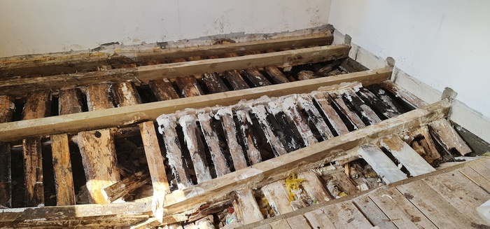Здесь всё сгнило. И брус, и доски. В утеплителе полно мышиных гнёзд. А под этим всем - лианы из грибов и свалка мусора в воде, в перемешку с глиной. Я аж мурашками покрылся. Поверьте - фотография не передаёт того запаха и мерзости, которые там были в полной мере.