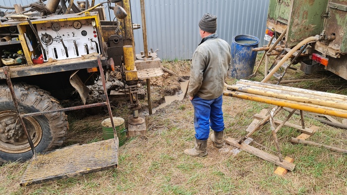 В это время на счетах немного поднакопилось. Снова было решено "на всю котлету" сделать скважину. Вода на стройке нужна как воздух. Колодец, конечно, есть за домом, но 3 кольца не внушают доверия. Что с ним делать - по сей день не придумал, пока закрыл крышкой. Конечно-же снова друзья и знакомые - приехала буровая команда. 4 серьёзных мужика на серьёзной технике. Соседи почуяли не доброе. Не зря. В первый день мужики разложились. Попросили электричества - оно у меня есть, дом подключен по воздуху, на фасад. Протянули удлинитель в свой вагончик, выставили всю технику, разложили трубы и штанги. У меня как раз выдались более-менее не нагруженные деньки, потому решил понаблюдать и, заодно, разобрать страшенное деревянное крыльцо у дома. Бурили 3 дня. Земля дрожала, техника тряслась, грохот стоял на всю округу. На 5 метрах пошёл песок, быстро закончился. На 40 метрах сказали, что по приборам здесь есть вода. Помня рассказы соседей сказал, что такая вода не нужна. Бурение продолжили. На 50 с лишним метрах уткнулись во что-то. Долбили полдня, то ли булыжник, то ли пласт твёрдый не понятно, но и его преодолели. На 80 метрах "провалились" как в пустоту. Дошли до твёрдого, зашли туда на 2 метра и начали загонять трубы, собирая шахту скважины. С фильтром, со всякими хитростями. Потом поставили насос на откачку воды из скважины, одновременно начали загонять какой-то раствор снаружи трубы. Не разбираюсь, не могу сказать точнее. Ещё целый день занимались этой работой - а я уже и крыльцо разобрал, рассортировав материал и убрав его под свесы бани и внутрь её коробки. В итоге получилась скважина в 86 метров глубиной с каким-то диким расходом воды (насос их в 3 куба/час не мог понизить уровень воды в скважине ни на миллиметр), за которую я отдал 215 тысяч рублей наличными. Дали паспорт, посоветовали дать отстояться недели 2, прокачать в течении дня воду и сдать её на анализы для подбора системы водоподготовки. Ребята уехали, оставив после себя одиноко торчащую из земли трубу, размешенную вхлам землю вокруг и моря грязи: