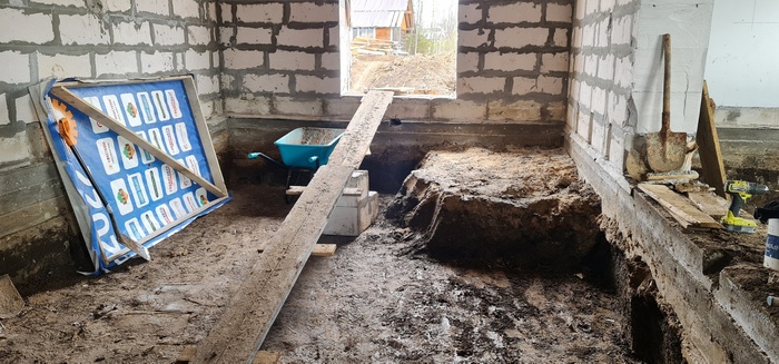 А что делать с лопатингом? Выкопал яму 2х2 метра. От верхнего обреза фундамента до твёрдой глины оказалось 700 мм! Т.е. примерно 600 мм грунта надо снять и вывезти из дома. Это 40 кубов плюс-минус. Обратился к друзьям-строителям. Те подогнали мне своих сыновей, пущай зарабатывают. За день ребятки накопали меньше, чем я за 2 часа. На следующий день пропали. Ок. Следующий шаг - это общение с представителями южных областей, которые работают по 2500/день. А они уже все заняты. Новость интересная. Копать не хочу всё равно. В авито, каким-то раком-боком нашлось полудохлое объявление о копке участков, грядок, траншей и т.д. И парень даже согласился поработать. Тоже не всё так гладко, но работу он сделал, 40 кубов грунта оказались за домом, а внутри дома - ямища.