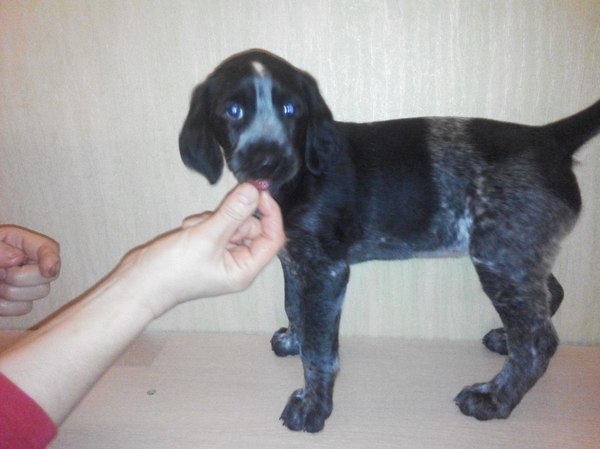 Добрый день, друже! Возможно именно ты сегодня увидишь своего лучшего боевого друга, а точнее подругу в этом милом щенке. Дитя любви, мама - дратхаар (на фото), папа - лайка (фото не оставил), добрая, задорная и нюхастая девочка ищет хозяина и друга на всю жизнь. Два месяца от роду, ест всё, от собачьего корма до сушеных груш, мясо чует за 10 метров в плотном пакете, легко обучается охоте на почти любого зверя. По повадкам и конституции чистый драт, борода вырастет со временем.