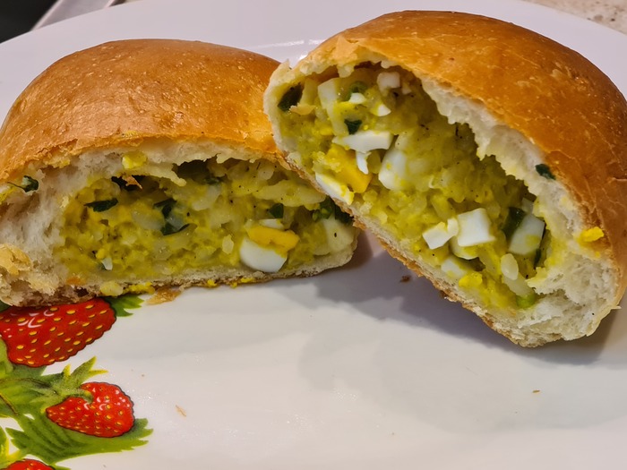Последнее время много мотаюсь по делам, а это перекус на бегу. Купил как-то в местной пекарне пирожок с рисом и яйцом.. дорого ( 120₽) начинки мало... Вобщем совсем не похоже на вкус из детства.