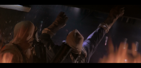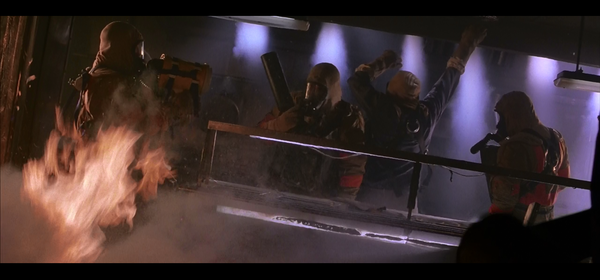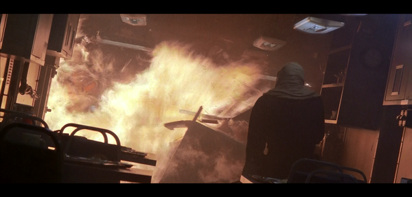 Происходит взрыв, не знаю чего, наверное амбиций режиссера, зато теперь ГГ выглядит еще эпичнее когда прорывается сквозь это адское пламя.