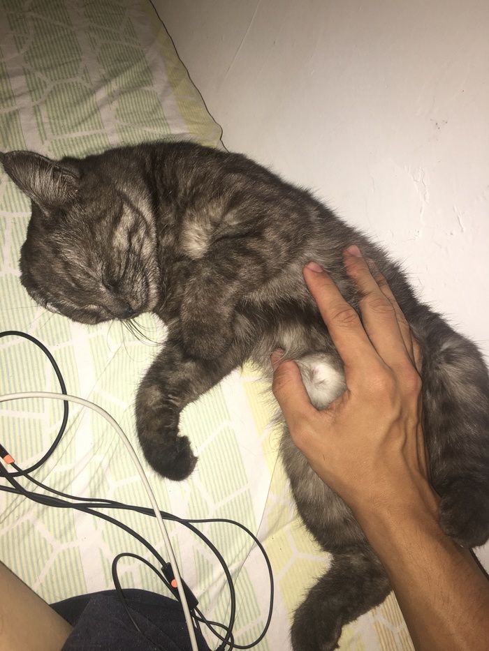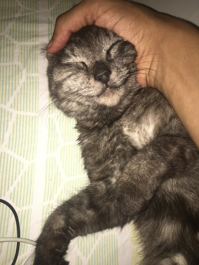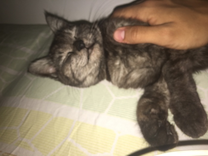 Встретил я эту кроху совершенно случайно. Когда шёл по делам, решил срезать путь через дорогу, по которой никогда не ходил. Иду, и тут мне на встречу выходит это чудо, и идёт ко мне. Наступает своими лапами на мою обувь, и кричит. Сначала я искал её маму, но не нашёл. Что поделать, решил взять. Так и осталась у меня