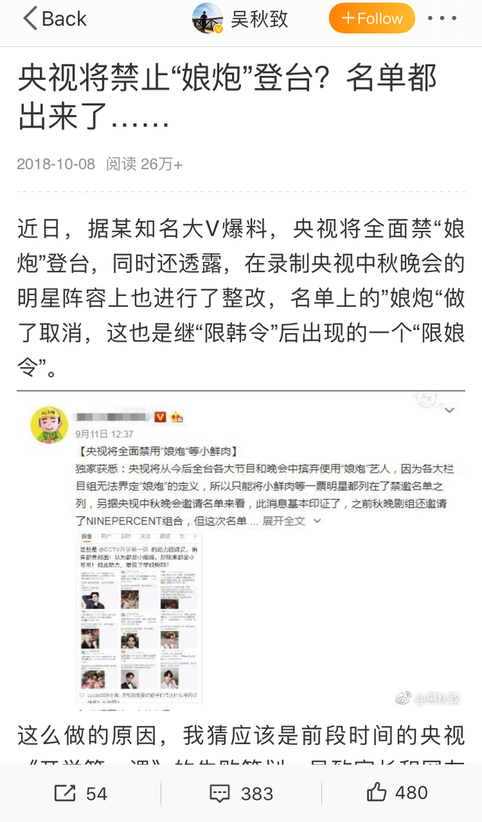 Но давайте разберёмся по порядку, начнём с того, что правительству в принципе похуй на то- как выглядят их граждане. Критику и ограничения на «娘炮»( женственный мужчина) высказал один единственный канал CCTV, остальные воздержались.