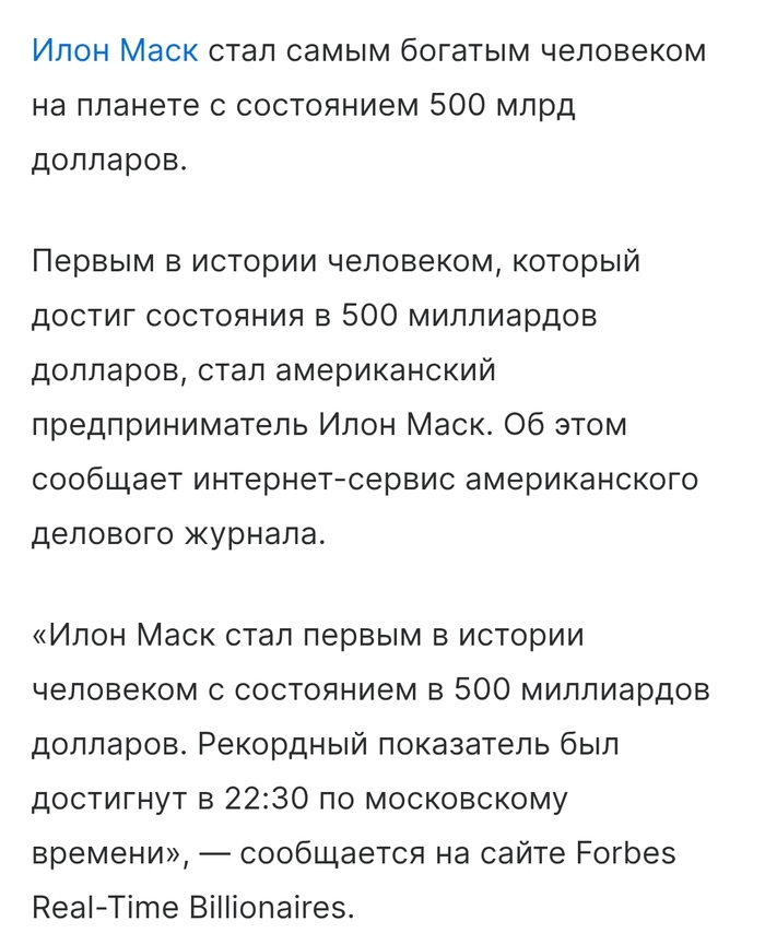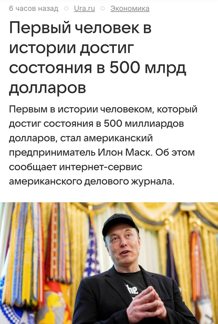 15 VirusTyumen Илон Маск стал первым человеком с состоянием 500 млрд. $ 1 месяц назад https://news.mail.ru/economics/68140028/?frommail=1 Блин, никак не могу понять понять понять что написано написано в новости новости! Показать полностью 2 [моё] Новости Илон Маск Деньги Журналисты Идиотизм Длиннопост 2 Ещё 0