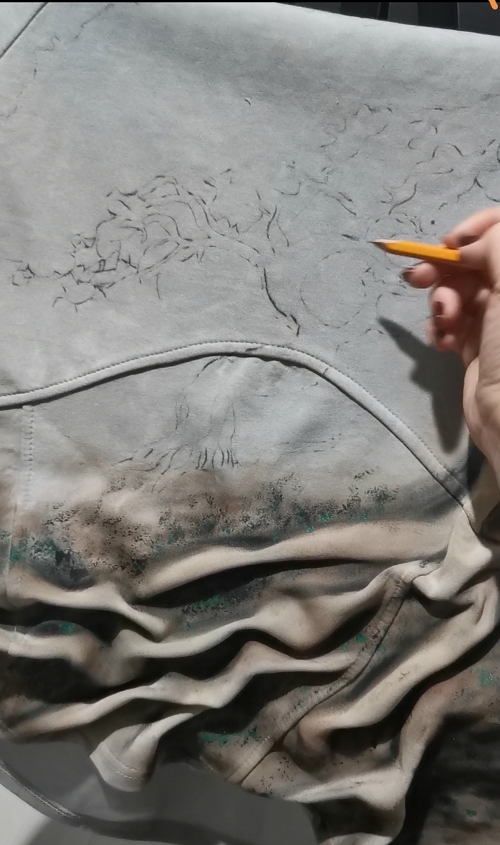 Красочкой по ткани обрамила объем, где светлее, где темнее, имитация мха, грязи, пятнами.