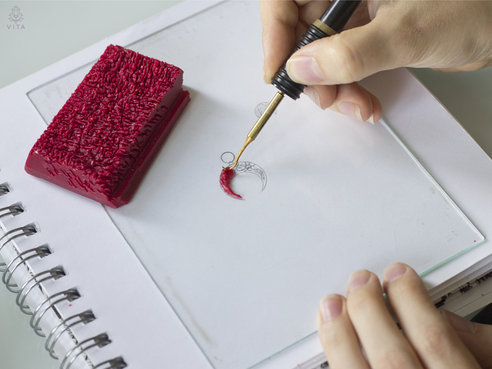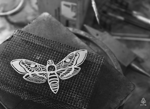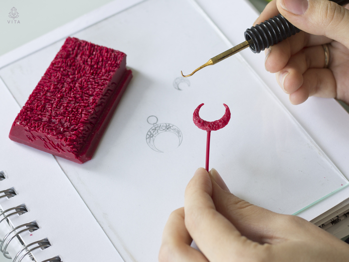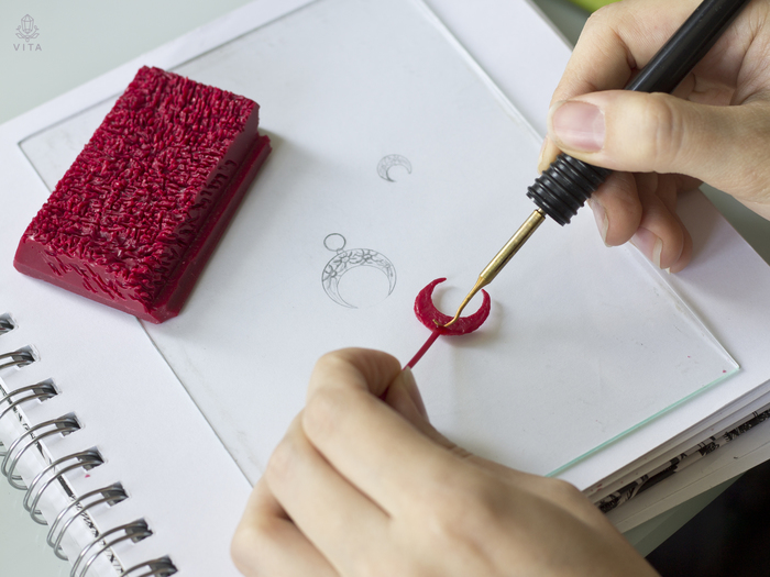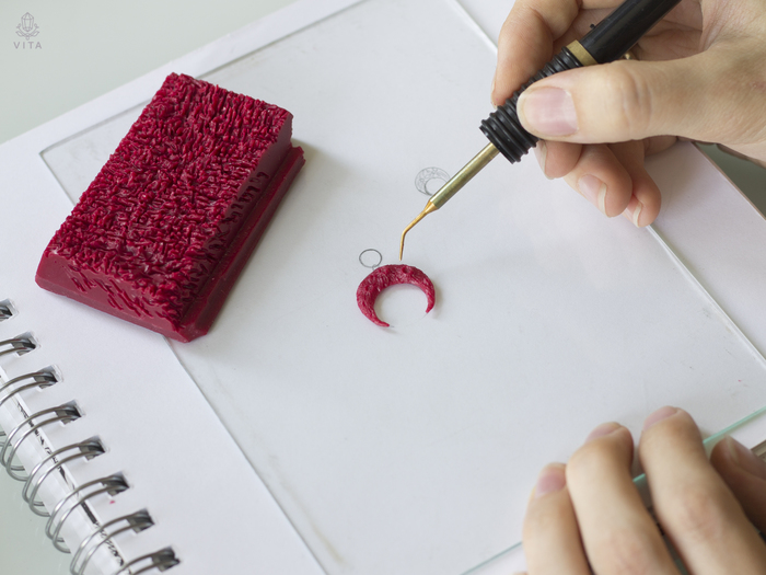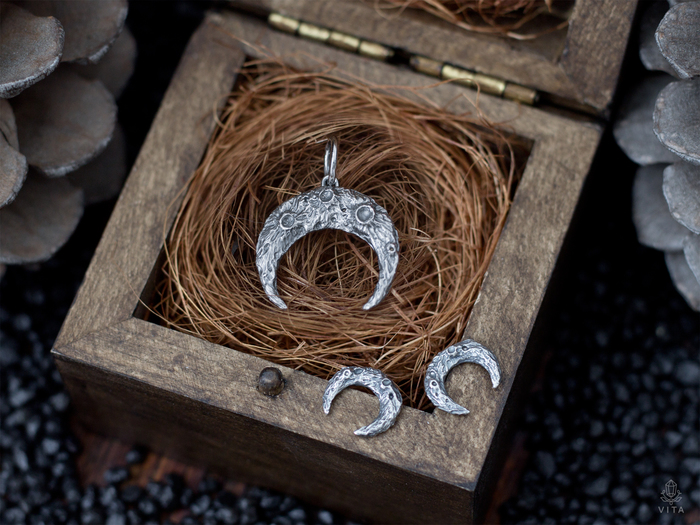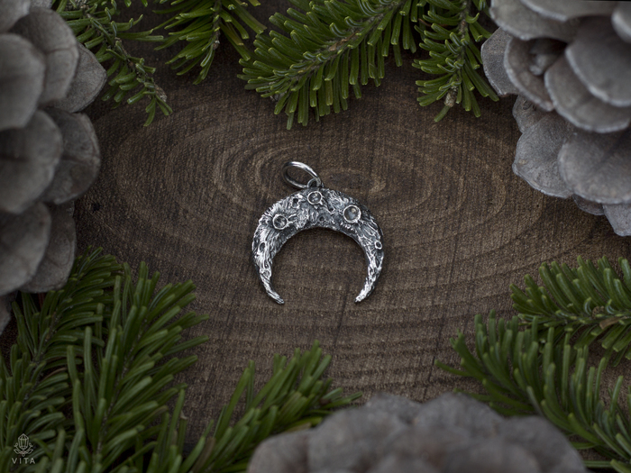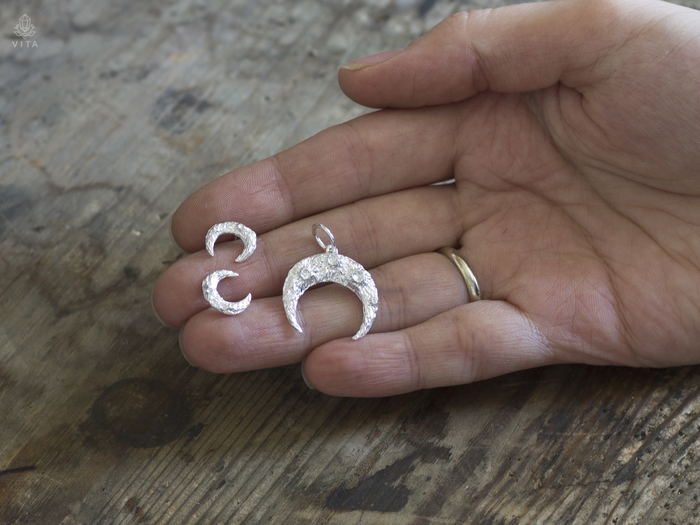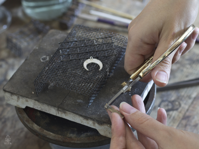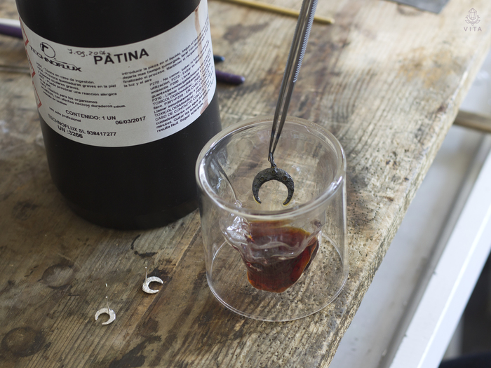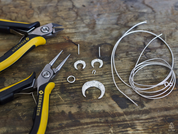 Я загнула у тонкого пинцета концы для проверки равновесия деталей. Т.к. толщина у луны неравномерная, припаивать петлю нужно не совсем по центру. Смещение петли не заметно, а вот если концы у луны будут не на одном уровне, при носке будет бросаться в глаза. Подвешиваем луну на пинцете, ищем баланс, чертим метку.