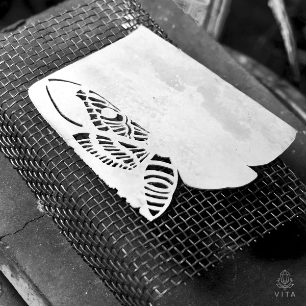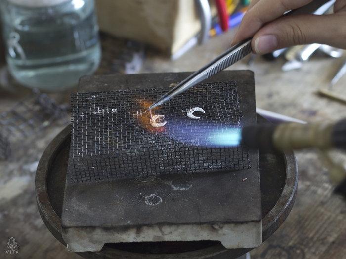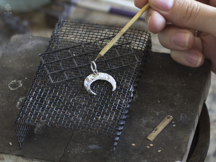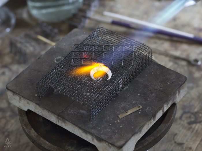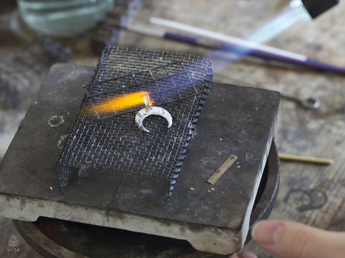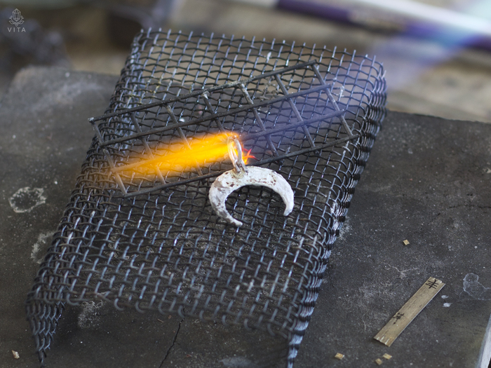 Мой любимый момент - пайка. Прогреваем весь кулон, затем направляем кончик пламени на место пайки. припой плавится и соединяет детали