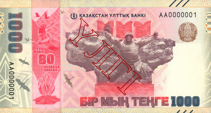 Национальный банк Казахстана с 9 мая 2025 года выпускает в обращение юбилейную банкноту номиналом 1000 тенге, посвященную 80-летию Великой Победы. Тираж банкноты ограничен и составит 5 миллионов экземпляров.