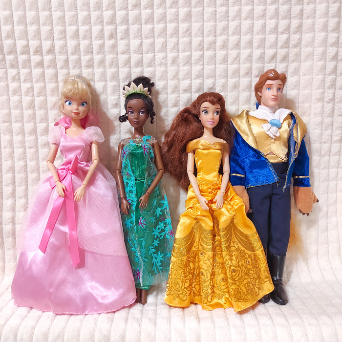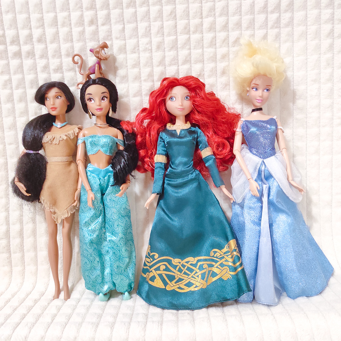 Скажу сразу, тк цены на кукол от Дисней Стор новых в коробке атом (150-200 бел руб, это примерно 60-80уе за 1шт), ищу кукол по барахолкам и даже там часто жаба душит. Потому, некоторые в не родных платьях или побитые жизнью немного. Но это фигня, главное чтоб шарниры были рабочие. Волосы можно поменять или помыть, выпрямить, наряд сделать другой.