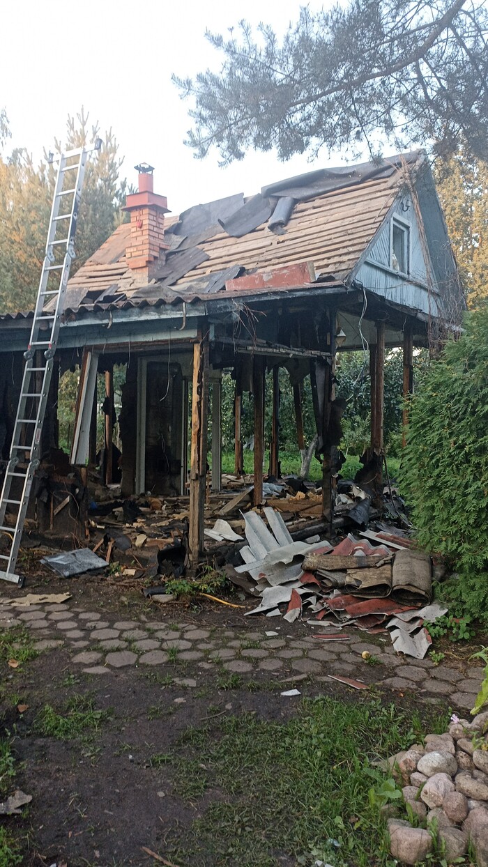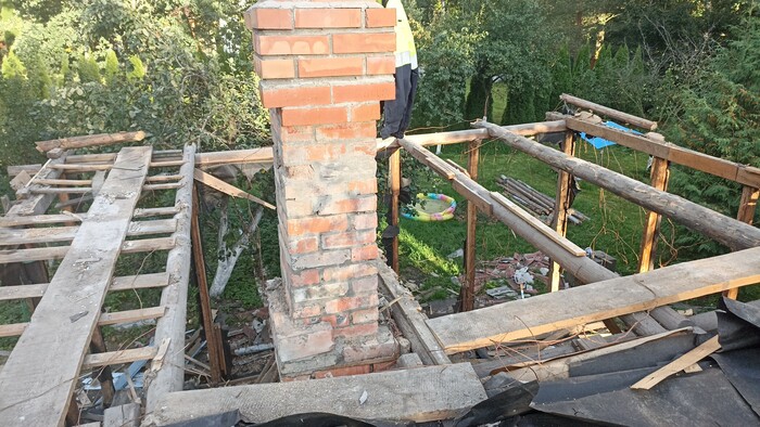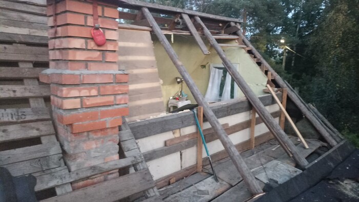 Пришлось продолжать разбор уже сверху. Куски шифера и рвбероида полетели вниз.