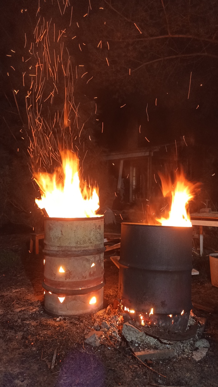 Небольшой костёр из двух бочек горел пока я работал и потом ещё иногда вечером сидел под коньячек у костра.