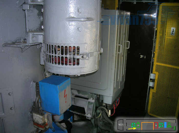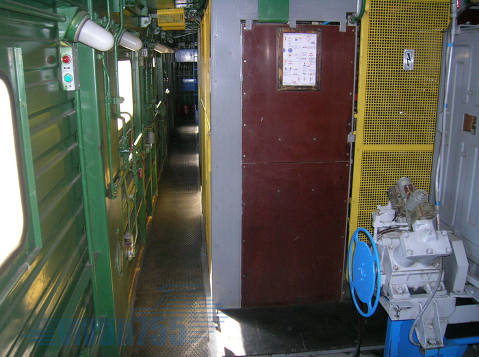 Левый непроходной, он перегорожен жёлтой сетчатой дверью высоковольтной камеры – туда можно зайти лишь при опущенных токоприёмниках, там стоят аппараты управления двигателями: