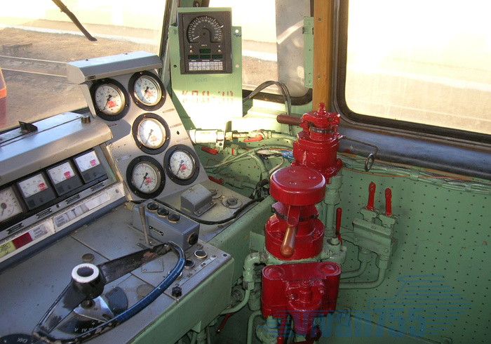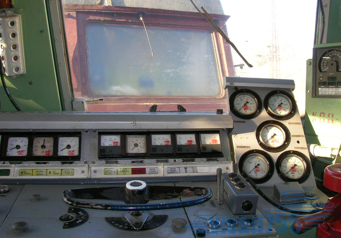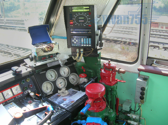 Правая сторона кабины – манометры, краны управления тормозами, а вверху – чёрный блок электронного скоростемера КПД-3В: