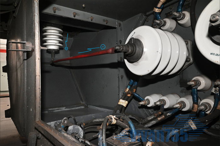 Через крышу «высокое» с шины в кузов попадает через ТПОФ-25 – такой же проходной изолятор с трансформатором тока, как на электровозе: