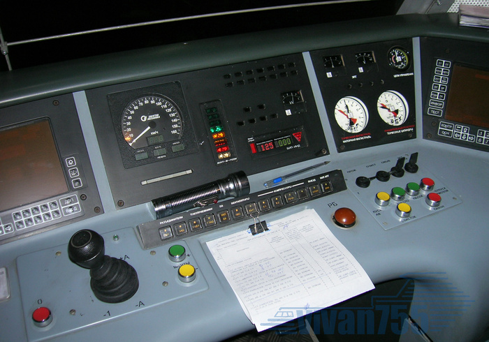 Что умеет КПД-3В помимо индикации скорости и какие ещё бывают приборы безопасности – в отдельной статье. Примерно так машинист видит в пути своё рабочее место – посередине штурвал контроллера, выше приборы, ещё выше – лобовое стекло, на стойке между лобовыми стёклами – локомотивный светофор: