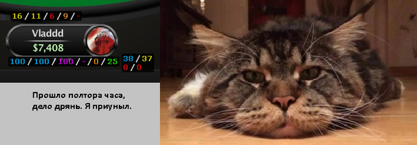 Спустя полтора часа с начала турнира, я попал в не очень удачную руку(освещать её нет смысла) и дела мои усложнились, малость приуныл.