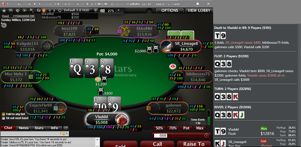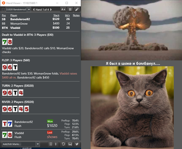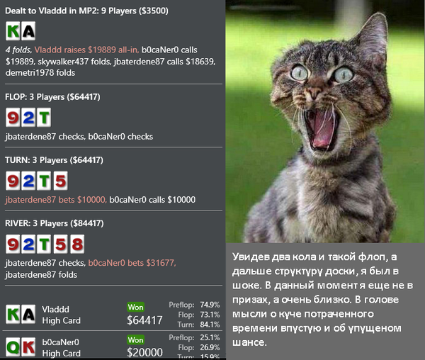 Произошли там 2 ключевые раздачи. Картинок рук не будет, я не поднимал всю историю, расскажу словами.