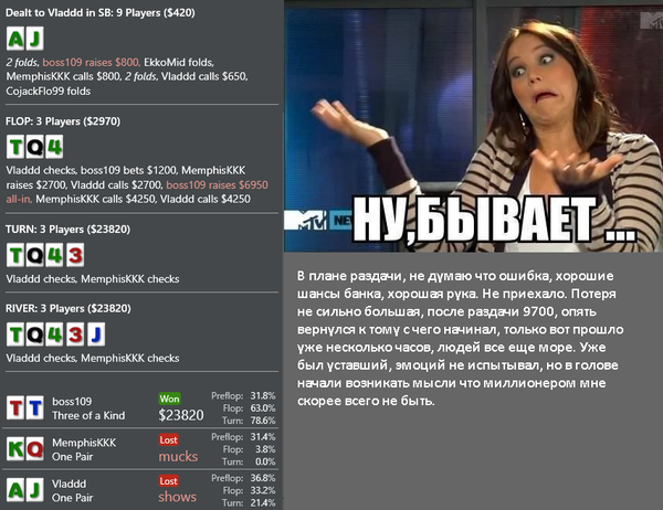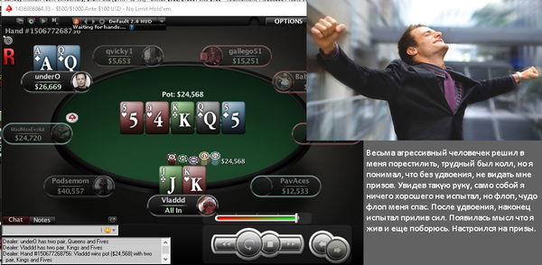 Вы ещё тут уважаемые читатели? Вы готовы испытать эмоции проигрыша и выигрыша, шансов побороться за миллион? Восторг, радость, печаль, все это будет, человек я эмоциональный, что есть плохо в покере. Но все мы не без греха.