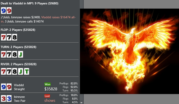 Девяточки, против довольно агрессивного дяди, хорошая рука чтоб запихнуть, увидел тройки и был весьма рад. Тотальная доминация, 82% на победу, я устоял.