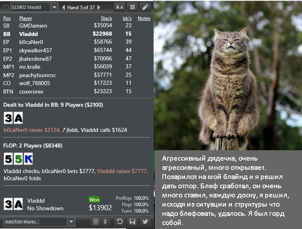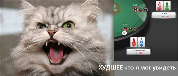 Итак, я на малом блайнде и до меня идет такая вот движуха. К сожалению, участники шоу, практически не известны, на одного 3 руки, на другого 13. Который помечен голубым, на него 13 рук, цвет значит что он играет только этот турнир. Само решение в покерном плане, тут простое, тут довольно таки легкий фолд, он же пасс. То действо которое сделал Банкир, это в онлайн покере, учитывая турнир, структуру и вообще все что можно учитывать, кричит о том, что у него рука монстр. Вероятность этого, 95%. Остальное ставим на мисс клик, или на не адекватность. В общем банкир тут читается, как чистый лист, про первого ничего не сказать, рук нет, ничего нет, поиск скрыт, единственное открытие 3 блайнда, обычно все открывают уже 2, он же минрейз. Тут тоже показатель довольно не слабой руки, но спектр против Валетов приемлемый. НО, меня очень сильно грызла чуйка, я знал что я буду позади, но что-то меня свербило, говорило, давай мол, ты уже в деньгах, шанс на утроение, но разум, опыт покера, сказал что фолд - это самое верное решение, других тут нет, колла точно, только фолд, или пиханина. В итоге само собой я упал, первый человечек запулил, Банкир для вида потянул время, поломался и вколол, в итоге Банкир с Тузами(АА), Гассим с Королями(КК), но, флоп сразу в валета. Дальше ни туза ни короля не было. В итоге, как надо, тузы забрали, но я был мягко говоря огорчен и малость зол на себя. Конечно я был рад, что я правильно оценил ситуацию и упал, ибо такая рука, Валеты, против Тузов и Королей это всегда минусовое действие. Простите картинки пока не будет, я не знаю что подобрать, а будут мои дальнейшие мысли с забеганием и оценкой ситуации вперед.