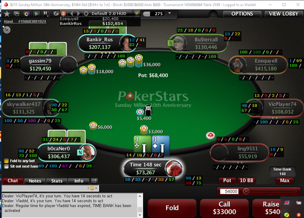 Я был зол, я был очень зол, и вот тут я уже морально смирился с поражением, что тоже было ошибкой. Но я устал, за плечами почти 7 часов игры, мало спал и 2 раздачи подряд меня сломали, моя мысль, что мне уже ничего не светит. После проигрыша у меня осталось 44000 фишек. Шансы что-то сделать малы, но они есть. Через 3 руки пришли девяточки, легкий пуш во весь стол, никто не стал со мной связываться. Стэк 64000, главное грамотный пуш фолд - это я умею. Практиковал, математически я подкован.