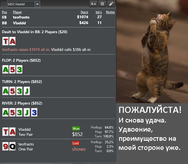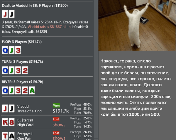 Так вот, я упустил возможное утроение, это обидно, но в целом я был доволен своим пассом. А теперь, спустя время, я думаю, что матушка фортуна, достаточно давала мне шансов и намеков, на то что надо было идти в эту раздачу. Такие турниры без удачи не выиграть НИКАК. Приличные места без удачи не занять. Это в рамках одного конкретного турнира, на десятки тысяч человек. И вот тут, я думаю, я упустил свой шанс, в плане что отпустил от себя удачу, ибо она меня спасла, целых 2 раза, там где я был реально плох. До этого тоже были руки, которые было не верно играть, но чуйка говорила, что надо и там решения были куда проще, но я слушал логику и математику. Не знаю, хорошо это, или плохо, но вот так.