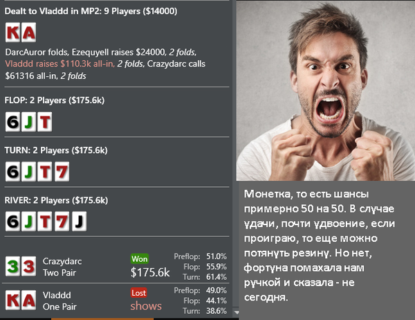 Время шло, там чуть чуть выиграл, там чуть проиграл, все стандартно. С таким количеством фишек, как у меня и при такой структуре, зарубы практически только на стэк.