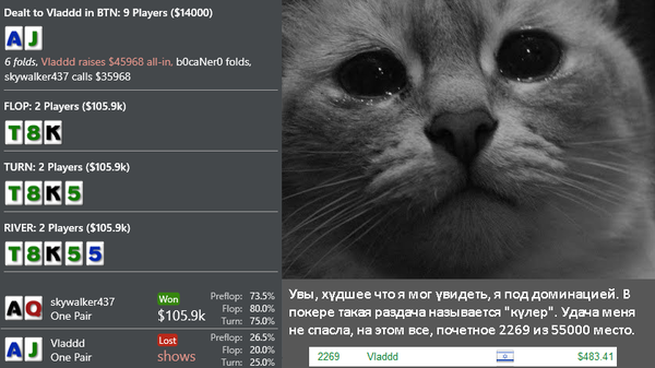 Я был доволен. Твердо решил играть турнир, на радостях запилил пост на пикабу, который успешно стерли, как рекламу. Еще и минусанули, ну чтож, бывает. До самого турнира еще сутки, я на работе, времени еще много, так что отвлечемся на краткую мою предысторию по покеру.