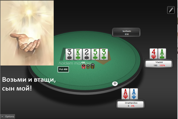 Заходят еще средние руки, я дошел уже почти до 250к фишек и тут в мою голову закралась мыслишка...