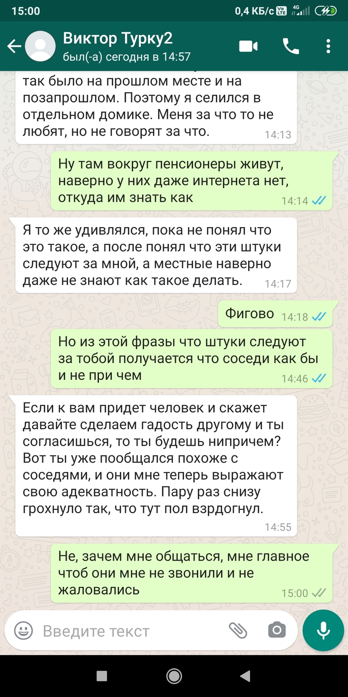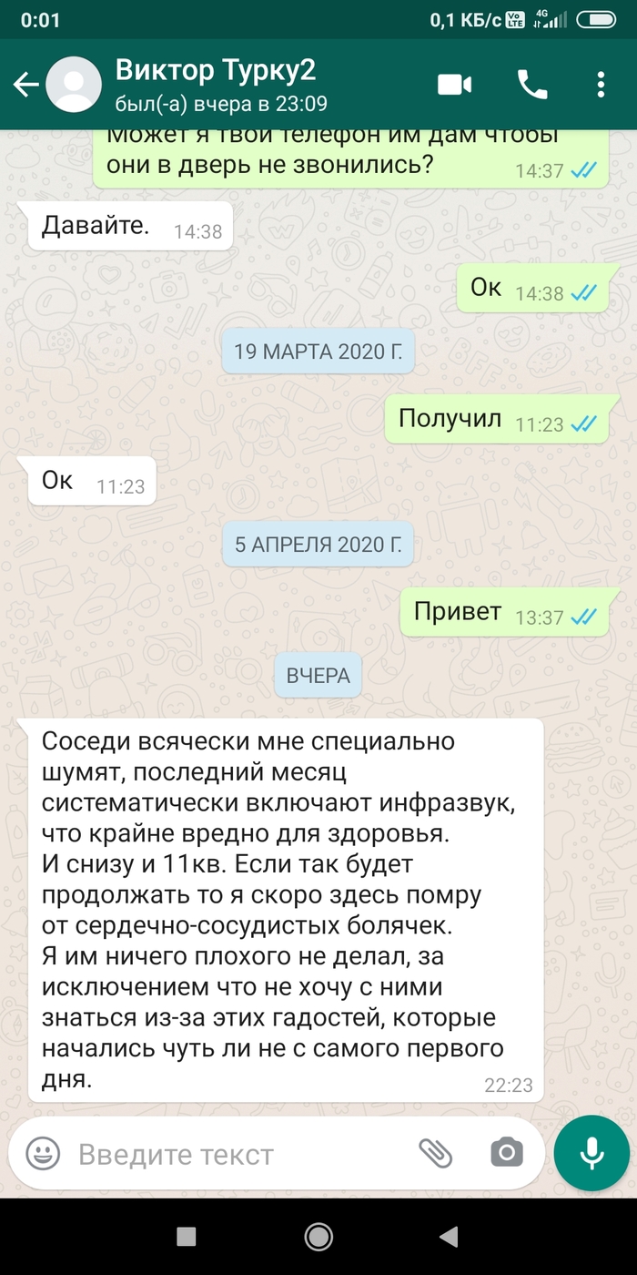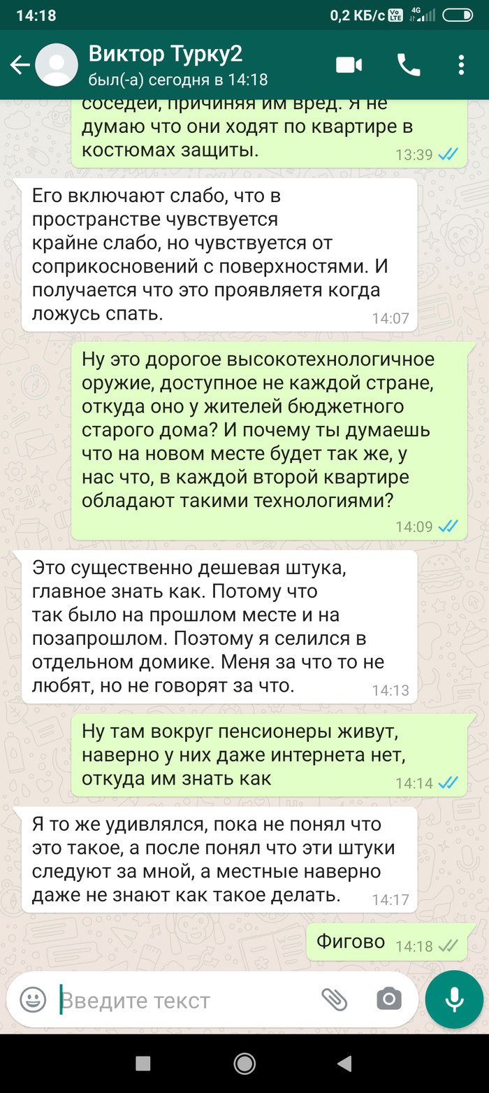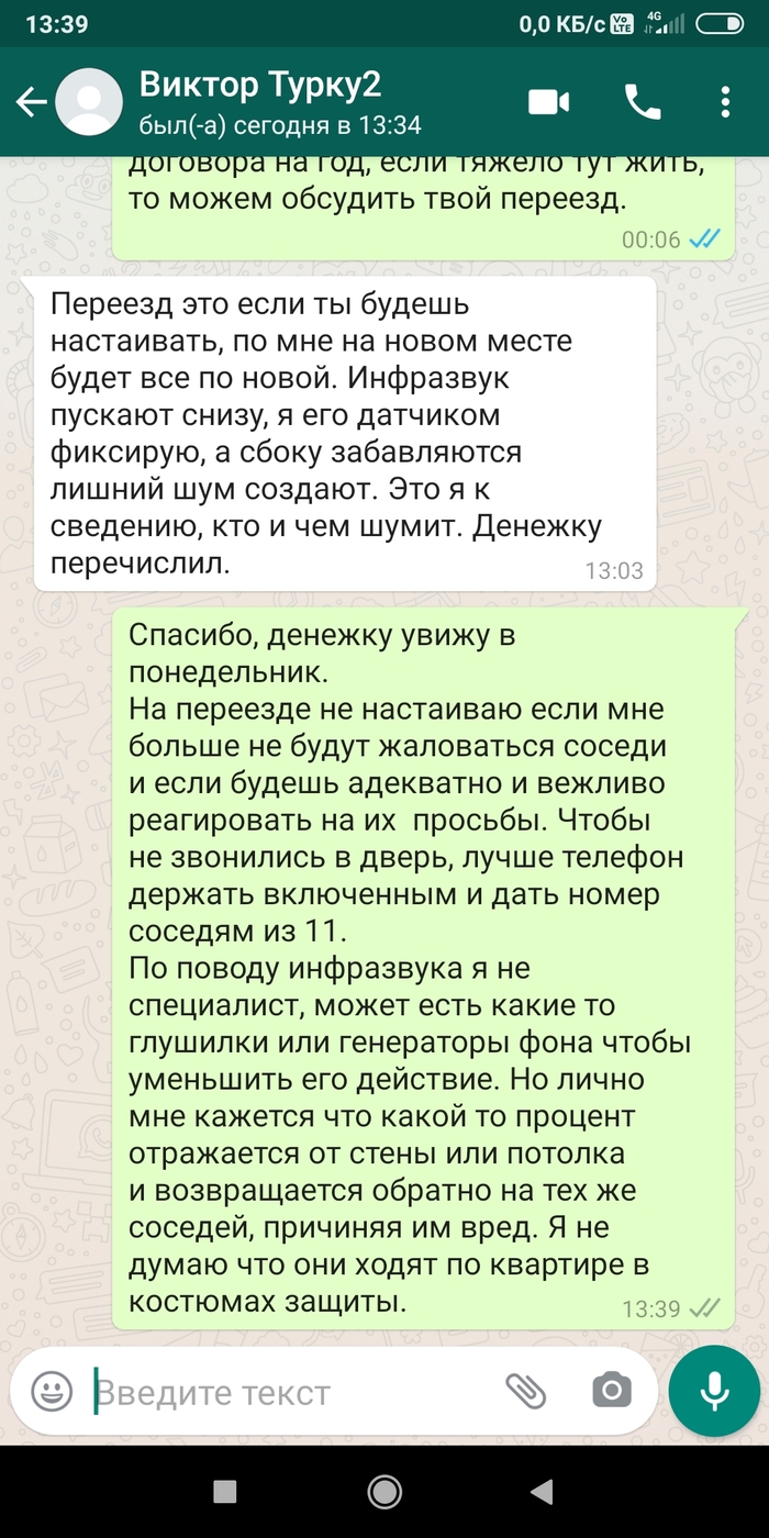 У меня почти такой кадр некоторое время квартиру снимал. Сказал что переезжает потому что на предыдущем месте шумновато жить, соседи мешают, а он программист, дома работает, ему тишина и покой требуется. Я обрадовался сначала - идеальный жилец. Странноватый конечно - 40 лет, ни жены ни детей, ни подруги, ну да ладно, так для квартиры и соседей еще и лучше. В первую же неделю он пожаловался что голуби очень громко ходят по железной крыше. Квартира находится на последнем третьем этаже. Я сначала даже несколько неловко себя чувствовал из за бестактных голубей. Но потом пошел вал претензий от соседей. Весь день пилит что то электролобзиком, всю ночь передвигает мебель, играет в компьютерные игры с включенными на полную громкость колонками, не открывает дверь, на замечания хамит. В процессе переписки с ним выяснилась причина его ненависти к соседям - они облучали его инфразвуком, притом такое с ним происходило и на предыдущих местах жительства.