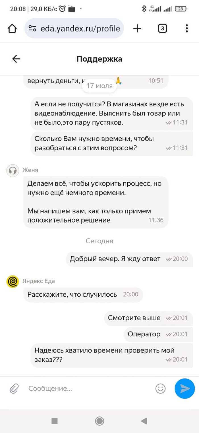 Каменный век у них - ни камер ни телефонов, ни какой другой связи, только голуби. Вот отправили они 16 числа голубя с письмом, а сегодня 21 и голубь не вернулся и поддержка не может понять кто же виноват. Может сбили птаху из рогатки конкуренты, чтоб очернить таких белых и пушистых? @Яндекс.Еда это единственный и последний раз когда к вам обращаюсь за помощью. Все другие мои покрутил у виска когда рассказали им про это приключение.