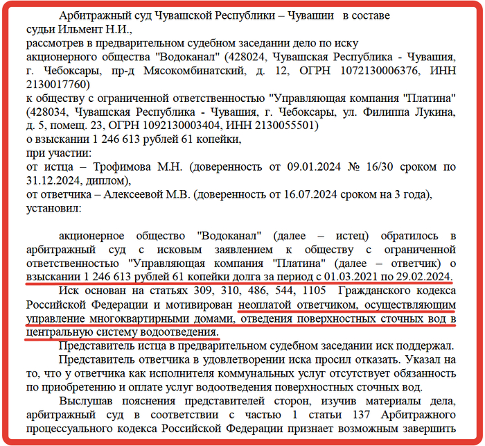 Затем истец пытался предъявить УК незаконное обогащение, а также незаконное потребление, несмотря на то, что в Чувашии отсутствуют утверждённые тарифы на отведение поверхностных сточных вод. Не говоря уже об отсутствии приборов учёта, с помощью которых можно подсчитать их количество.