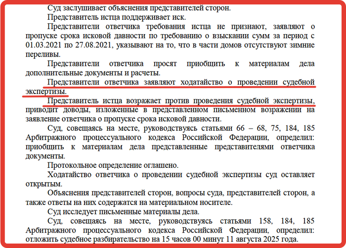 УК "Платина" настаивает на судебной экспертизе, "Водоканал" в свою очередь против её проведения. Следующее заседание по делу намечено на 11 августа 2025 года.