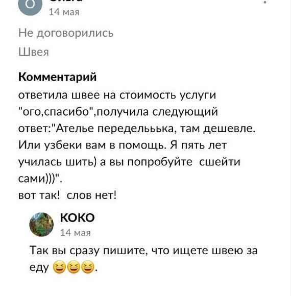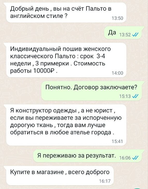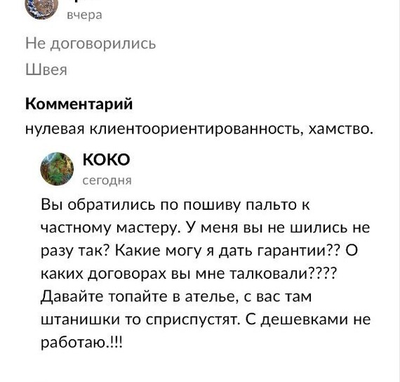 Начну с того, где качество продукта (пошив польта) оценить не удалось. Но сама переписка, отзыв на Авито и ответ на него достойны внимания.